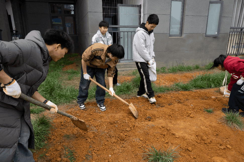 在启动仪式后,张佳佳和何军臣带领同学们分组前往实践地点(D3宿舍楼周边)进行劳动教育。在活动中,两位老师以身作则,激励同学们积极参与,大家互相帮助,共同完成“以花易石”的任务,包括捡石、松土、撒种、填土和浇水等环节。捡出的石子统一堆放,废石则集中放置在中庭垃圾桶旁。