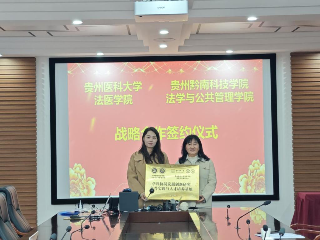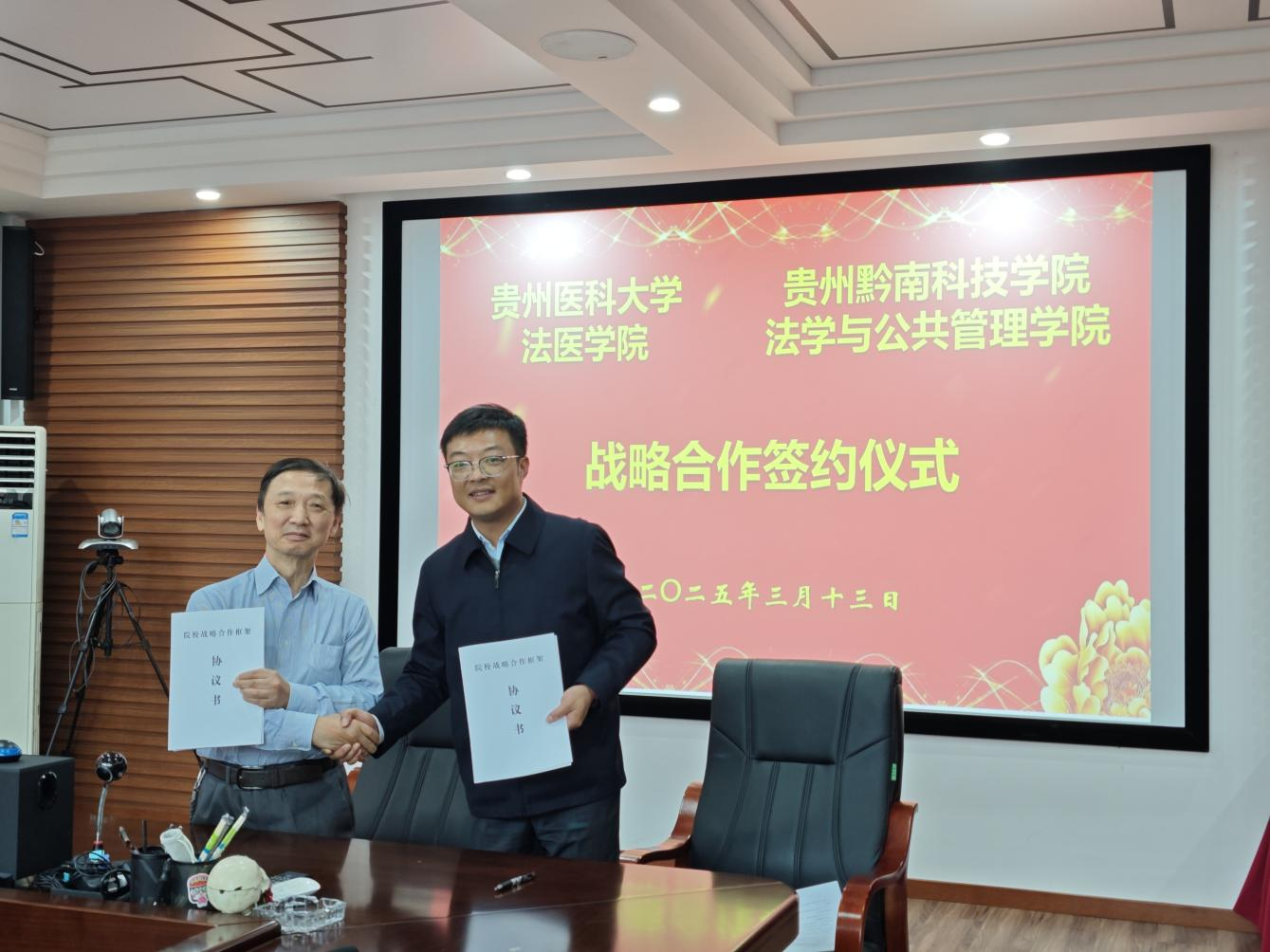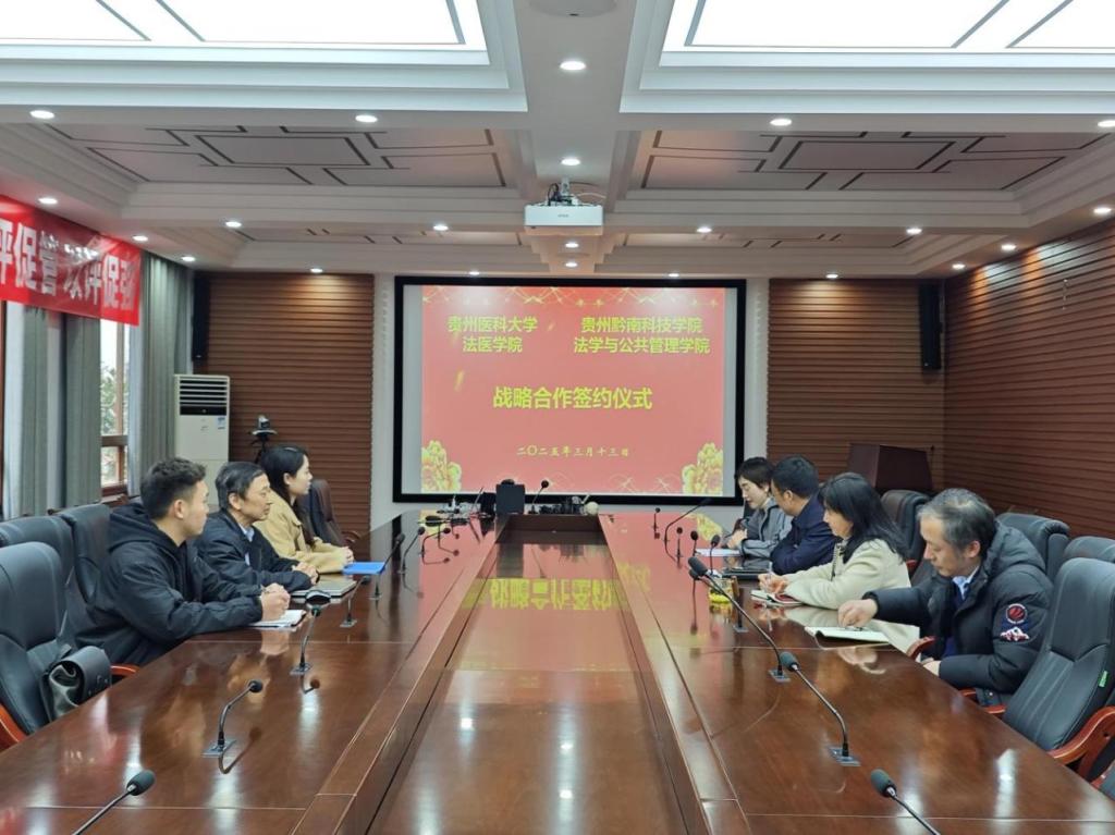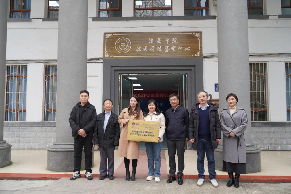 党委书记封韬、副院长兼法医司法鉴定中心主任夏冰、副院长任峥、法医临床教研室教师黄仕美以及贵州黔南科技学院法管学院党委书记张莉琳、党委副书记兼院长赵平等学院领导。