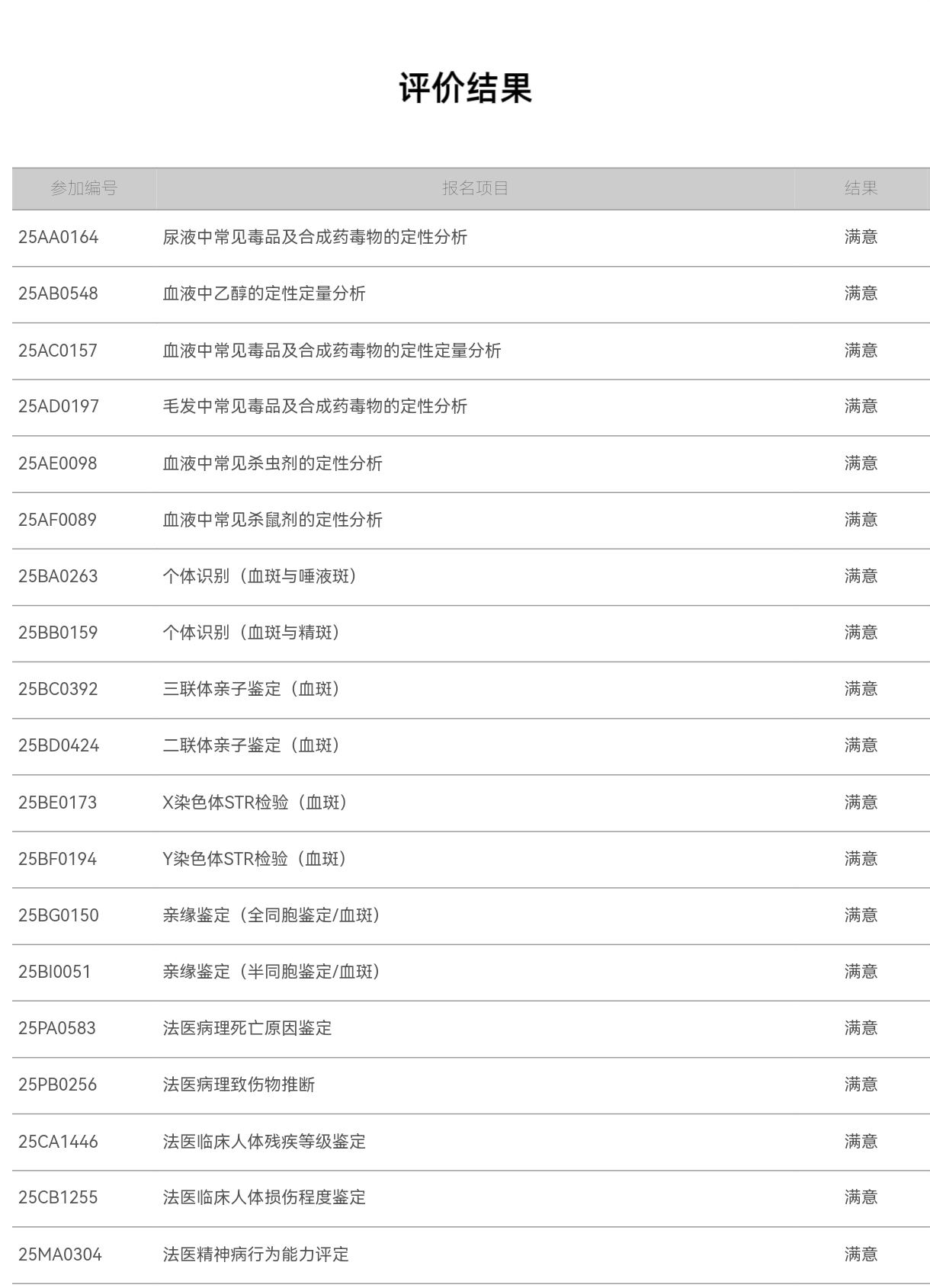 报名参加的法医毒物鉴定、法医物证鉴定、法医病理鉴定、法医临床鉴定、法医精神病鉴定五大类19个项目均获“满意”结果。
