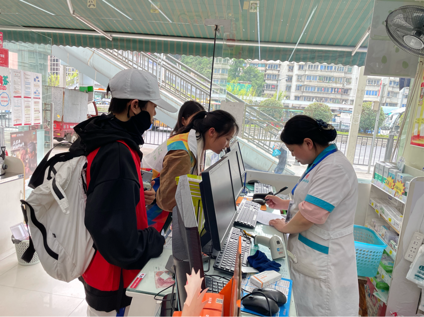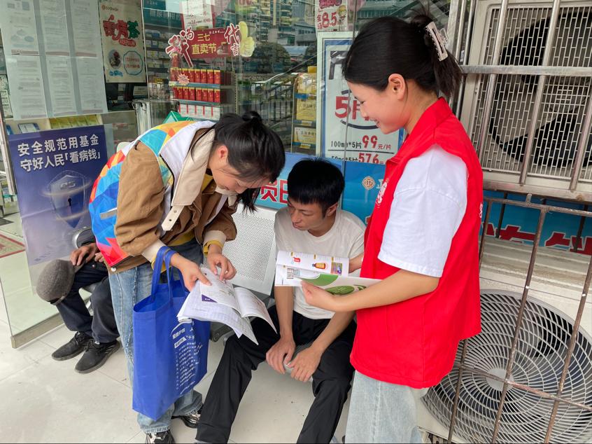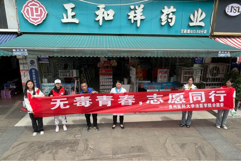 社会实践小组志愿者联合阳光春天社工服务社服务人员到甘荫塘周边药店开展禁毒宣传活动。这是91在线