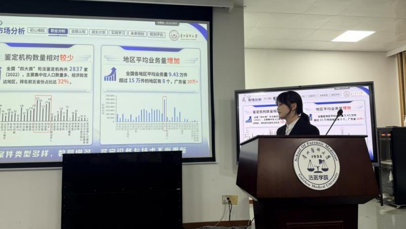 大赛流程设计紧凑合理,各参赛选手依据抽签顺序依次登台亮相,他们凭借精心制作的PPT和生动流畅的讲解,展示了个人独具特色的职业规划,充分展现了法医子对未来职业发展的深入思考与积极谋划。紧接着,张慧结合自身丰富的参赛经历和深刻的成长感悟,毫无保留地分享了宝贵经验,让在场选手收获颇丰、深受启发。
